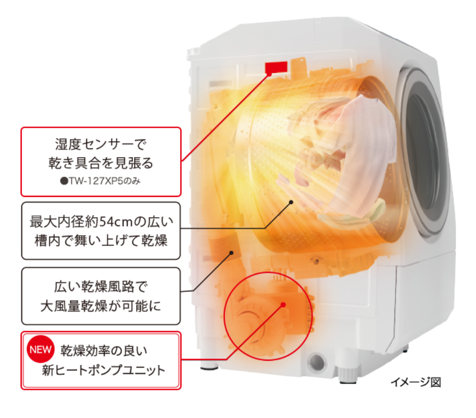 引用元:ふんわリッチ速乾(TW-127XP5、TW-127XH5、TW-127XM5) | 商品特長 | 洗濯機・洗濯乾燥機 | 東芝ライフスタイル株式会社 https://www.toshiba-lifestyle.com/jp/laundries/feature/drum_dry (2026年1月24日参照)